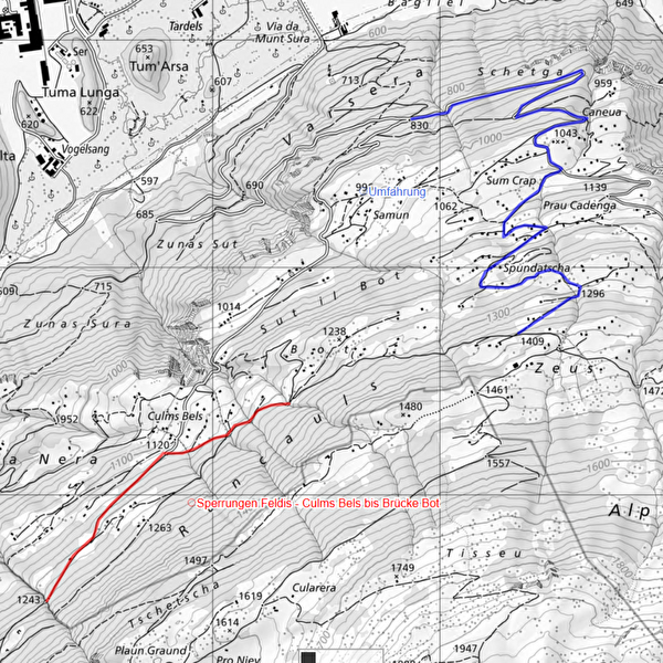 Ab Montag, 20. Oktober 2025, 07:00 Uhr sind die Streckenabschnitte Culms Bels – Feldis sowie Culms Bels – Zeus (bis Brücke Bott) mit Wartezeiten für den Verkehr freigegeben.